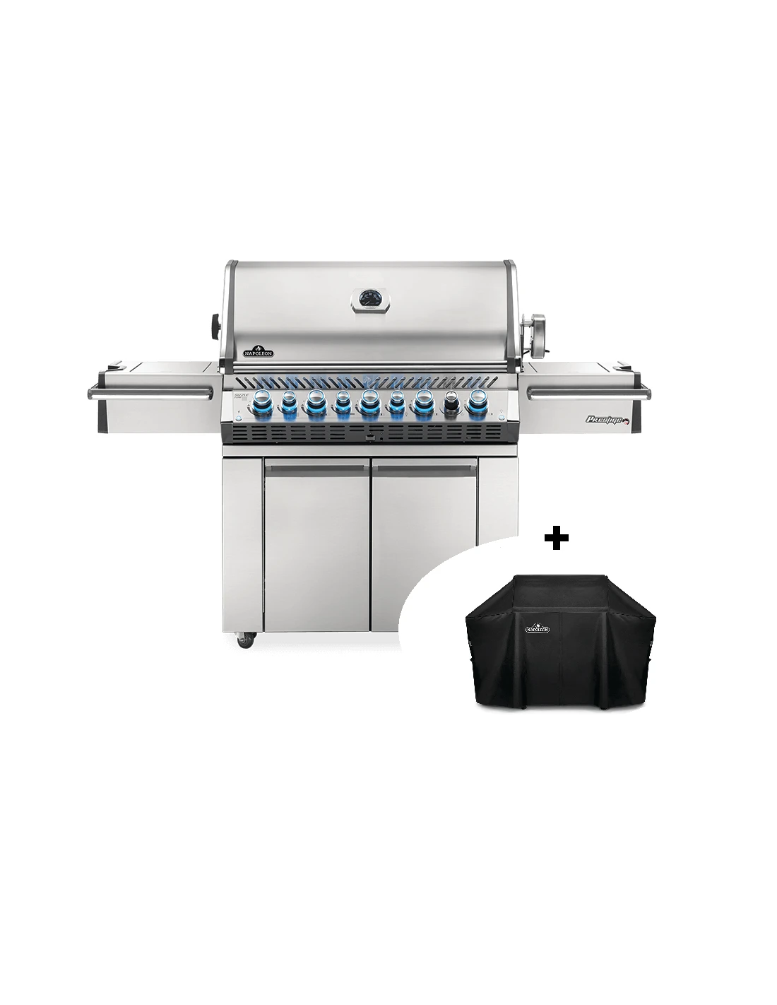 Magnifique barbecue tout équipé avec fumoir intégré, boutons de commande à éclairage LED, tout inox, 8 brûleurs, capacité de cuisson pour 20 personnes.
