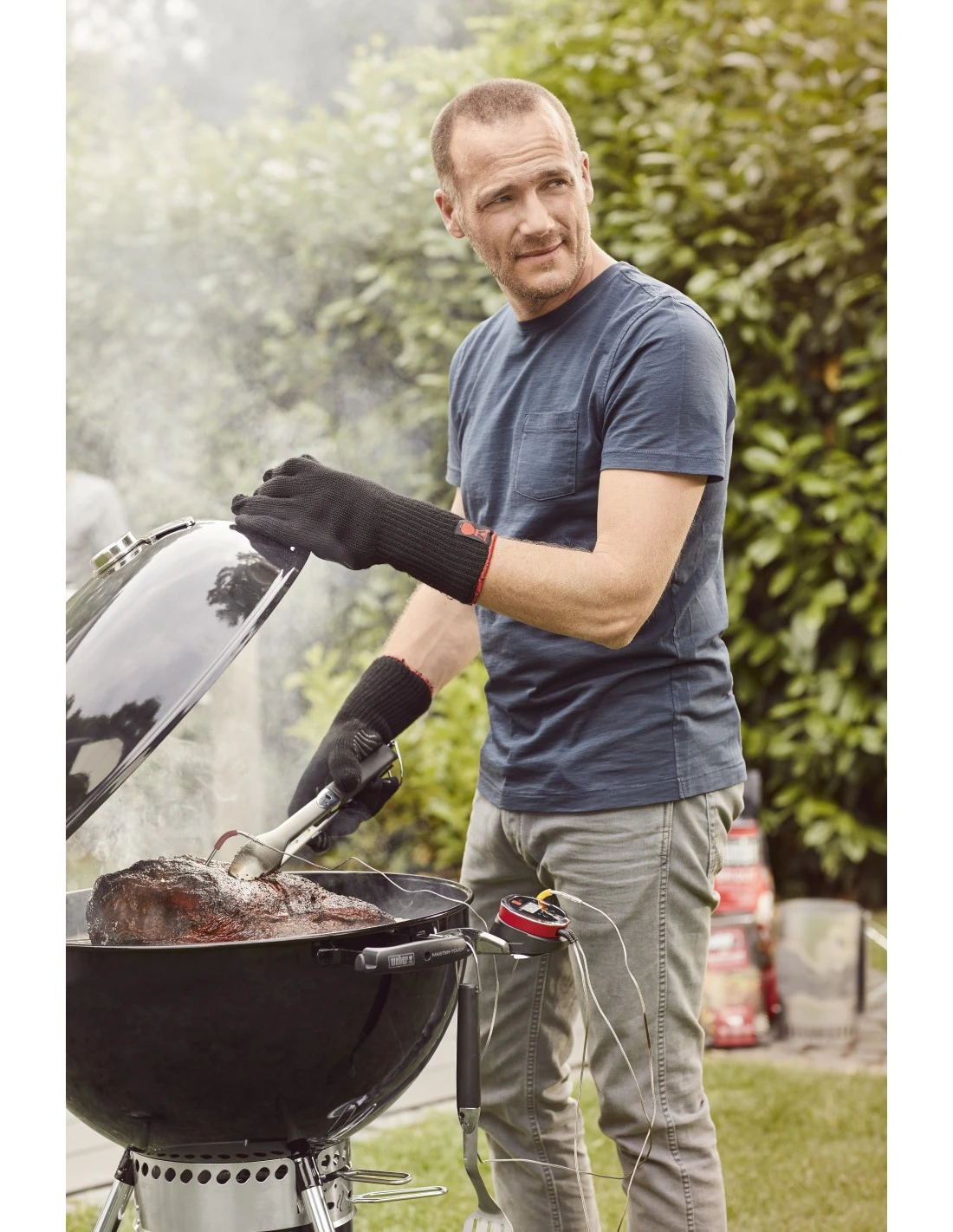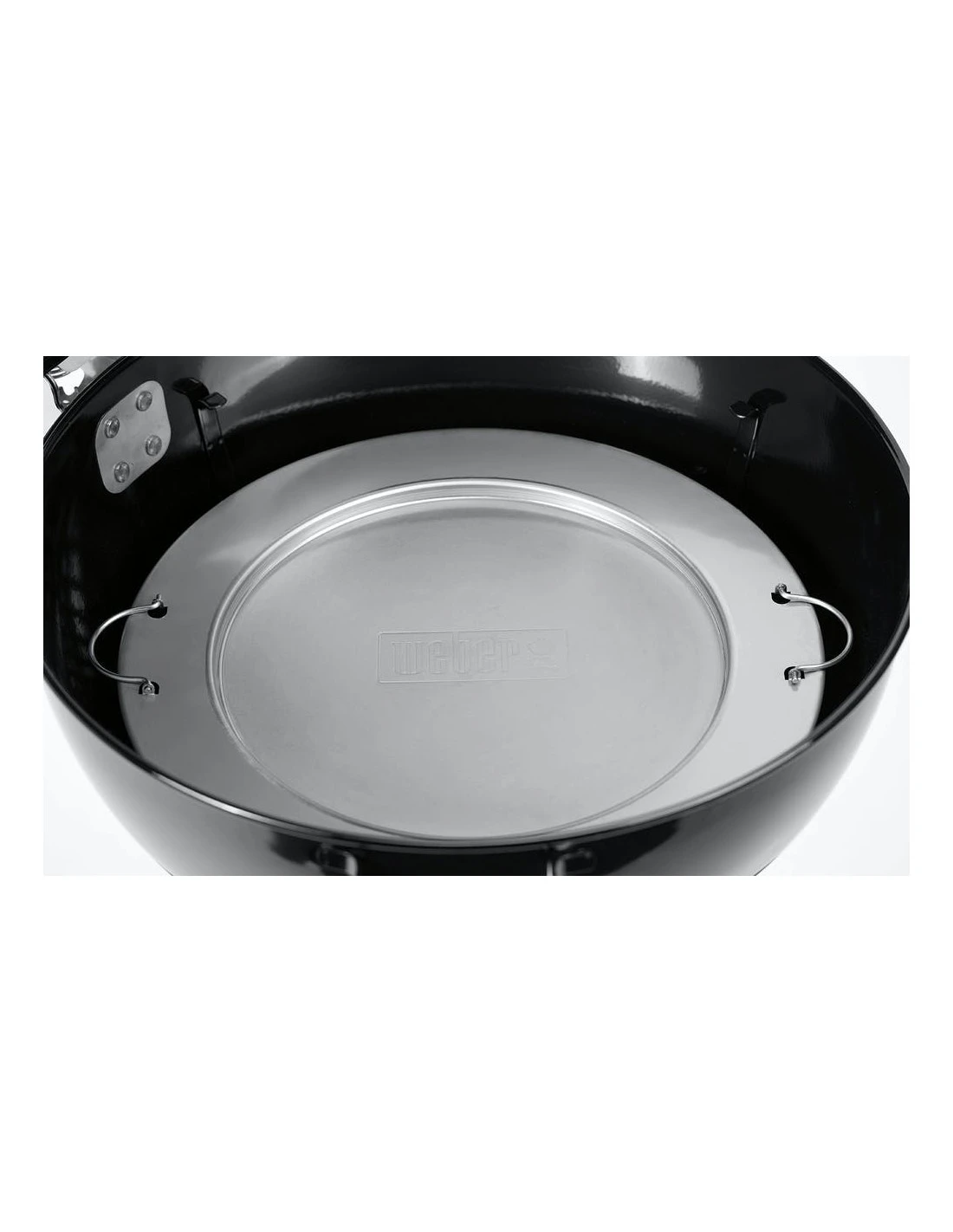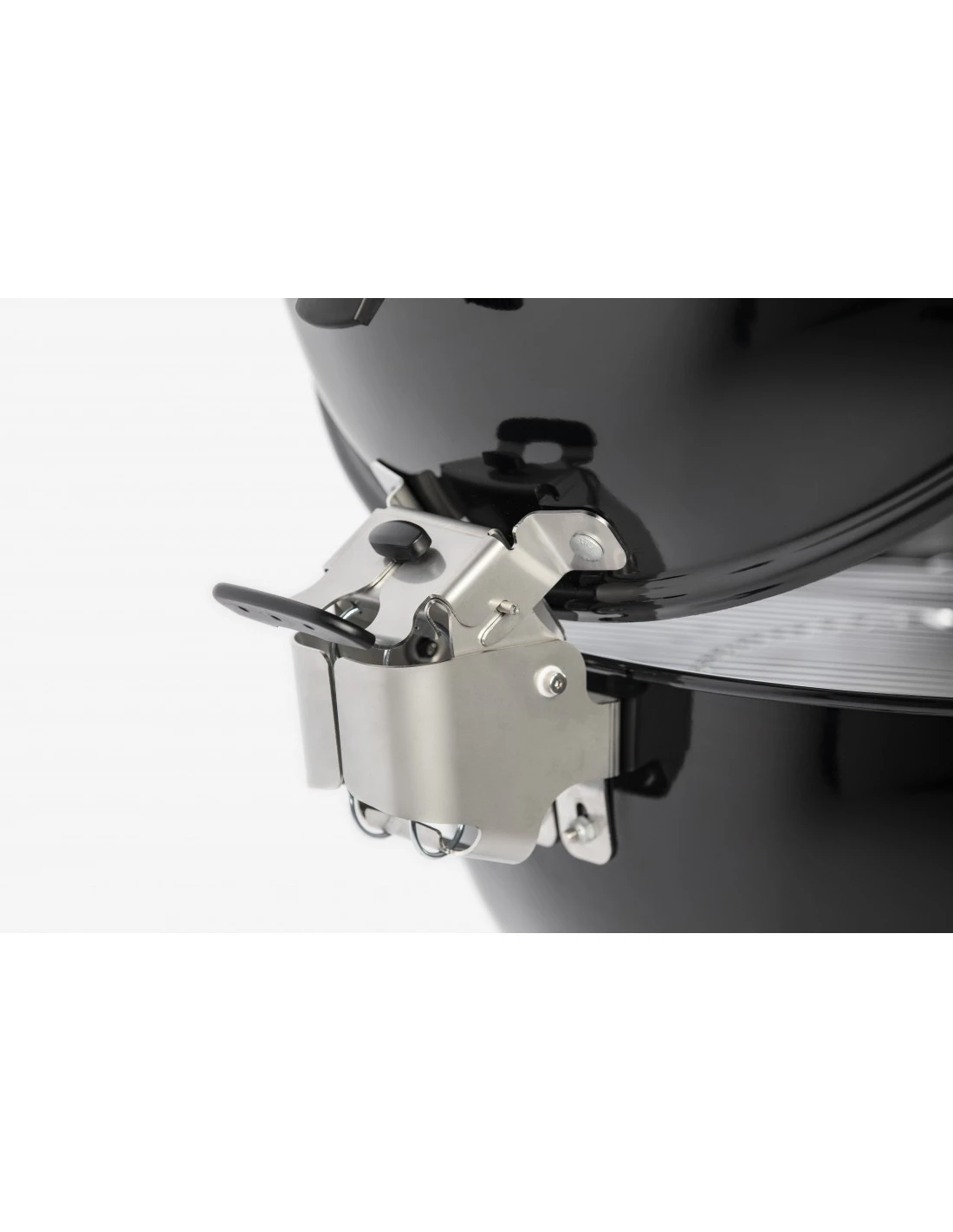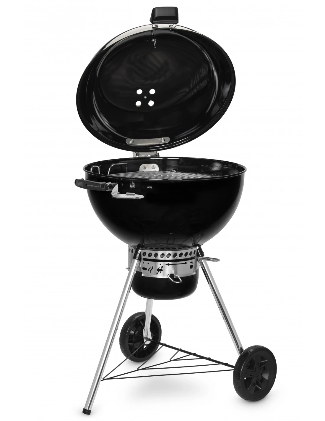 Ce barbecue Master-Touch à charbon amélioré dispose d’un couvercle à poignée avec une charnière pour maintenir le capot ouvert.